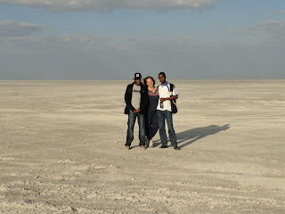 We1st tried to stay in Nata but there was no rooms available at the lodge we went to. Pollen said there was a lodge in Sua so we tried there. If we stayed there we could drive around the pans in the morning and then head out. The road to Sua was under construction. we went on and off the road. We finally got to Sua but the lodge was further down the road by the salt mine. We finally got there, Amos and Pollen slept in the car. Actually we were all supposed to stay in the car but that didn't end up happening. Miya and I stayed in the room. Again, not my kind of place, yes I am a snob. I would have been ok in the car. All I could think about was bed bugs and then I had a dream about lice on the bed. We had dinner at the lodge and the guys played pool. We got up early, had a few snacks for breakfast. I walked around and took some pictures of birds. I did see a few new ones, a pied barbet and a black flycatcher. After we packed up, we drove to the pan. It was so white and so large. There was a springbok walking on the pan and some wildebeest on the long grass that went along the pan. We stayed there a bit and then drove by the mine and then back toward Francistown with a stop first at Amos' cattle post.
